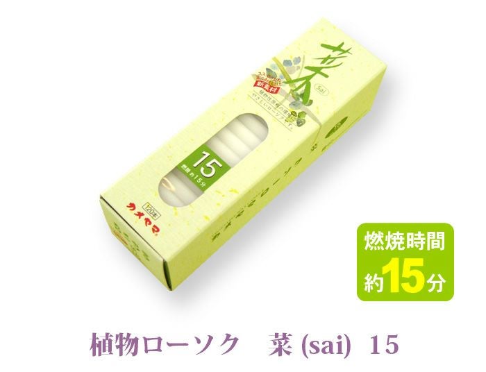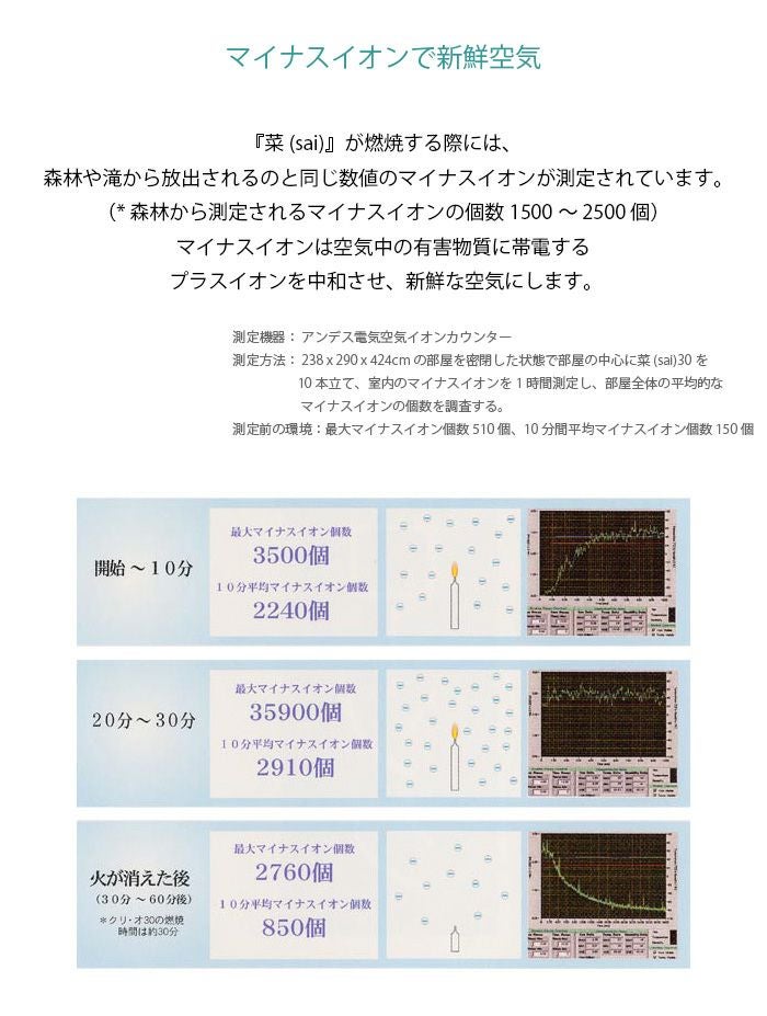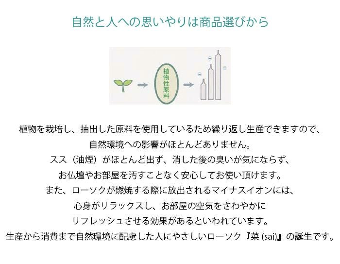 植物を栽培し、抽出した原料を使用しているため繰り返し生産できますので、自然環境への影響がほとんどありません。スス(油煙)がほとんど出ず、消した後の臭いが気にならず、お仏壇やお部屋を汚すことなく安心してお使い頂けます。また、ローソクが燃焼する際に放出されるマイナスイオンには、心身がリラックスし、お部屋の空気をさわやかにリフレッシュさせる効果があるといわれています。生産から消費まで自然環境に配慮した人にやさしいローソク『菜(sai)』の誕生です。