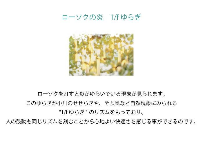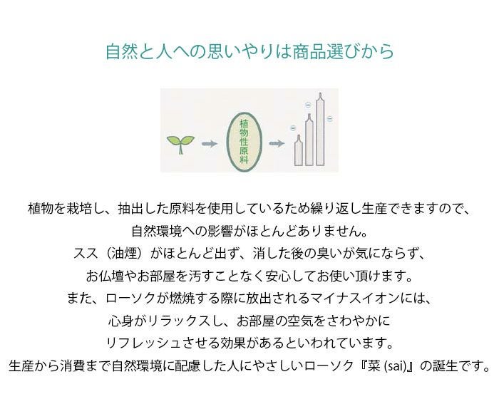植物を栽培し、抽出した原料を使用しているため繰り返し生産できますので、自然環境への影響がほとんどありません。スス(油煙)がほとんど出ず、消した後の臭いが気にならず、お仏壇やお部屋を汚すことなく安心してお使い頂けます。また、ローソクが燃焼する際に放出されるマイナスイオンには、心身がリラックスし、お部屋の空気をさわやかにリフレッシュさせる効果があるといわれています。生産から消費まで自然環境に配慮した人にやさしいローソク『菜(sai)』の誕生です。