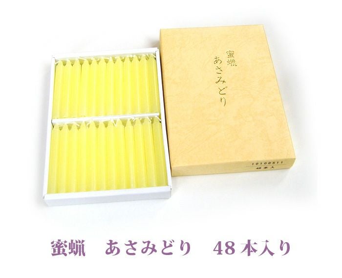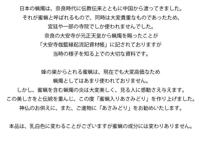 蜂の巣からとれる蜜蝋は、現在でも大変高価なため蝋燭としてはあまり使われておりません。しかし、蜜蝋を含む蝋燭の炎は大変美しく、見る人に感動さえ与えます。この美しさをと伝統を重んじ、この度「蜜蝋入りあさみどり」を作り上げました。神仏のお供えに、また、ご進物に「あさみどり」をお勧めいたします。