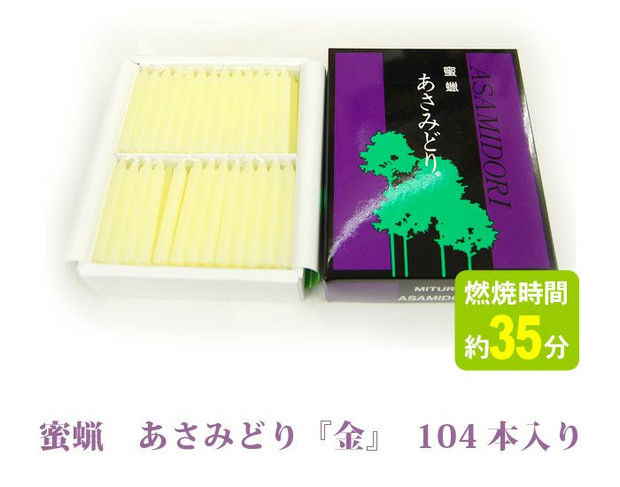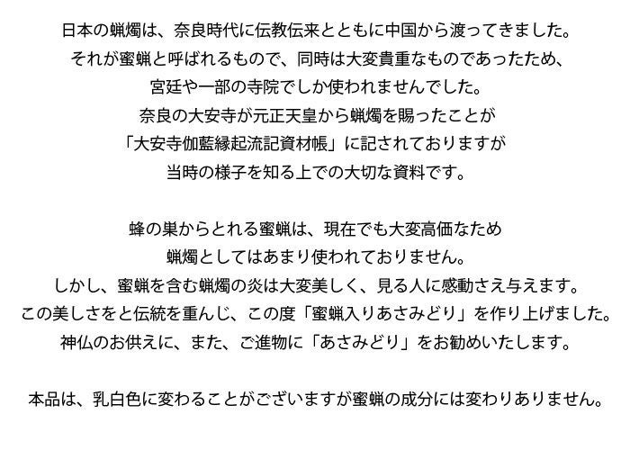 蜂の巣からとれる蜜蝋は、現在でも大変高価なため蝋燭としてはあまり使われておりません。しかし、蜜蝋を含む蝋燭の炎は大変美しく、見る人に感動さえ与えます。この美しさをと伝統を重んじ、この度「蜜蝋入りあさみどり」を作り上げました。神仏のお供えに、また、ご進物に「あさみどり」をお勧めいたします。