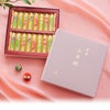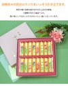 桜色の箱に金紙を組み合わせた上品な化粧箱。8種類の花が2組並べられ、贈り物としてもおしゃれでかわいらしい装いとなっています。
