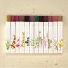 「蝋梅」「白梅」「沈丁花」「しだれ桜」「藤」「梔子」「百合」「桔梗」「金木犀」「秋桜」「椿」「水仙」と12種類の香りを揃えたアソートタイプのご贈答用お線香です。