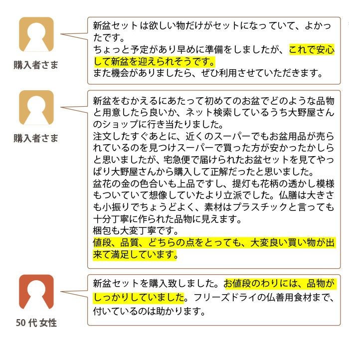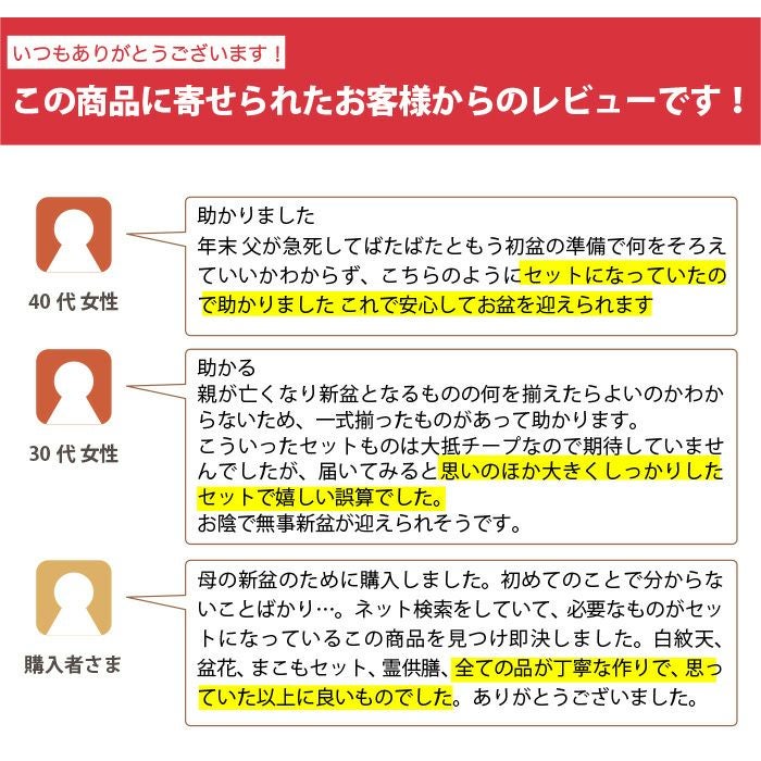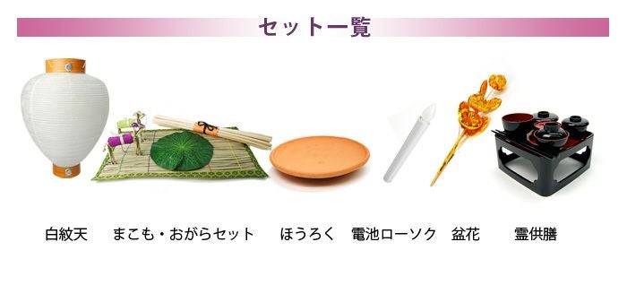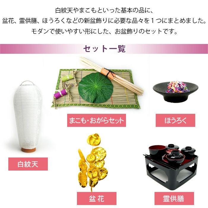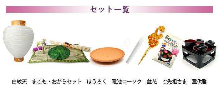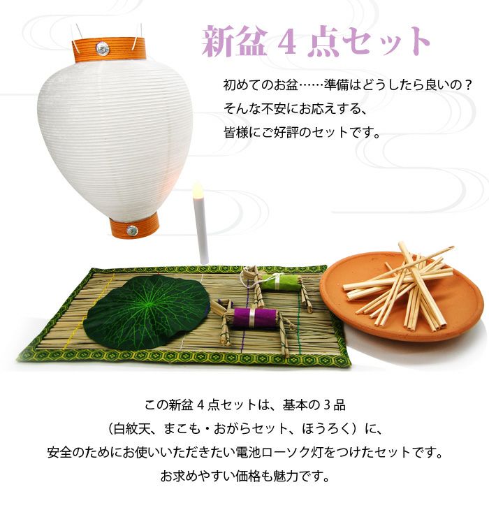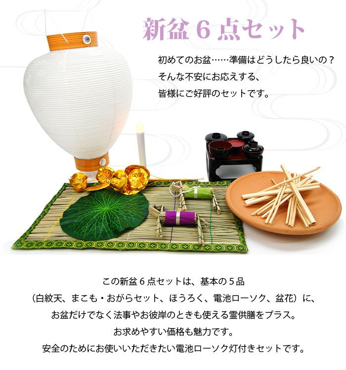 他の画像を見る 【ネットショップ限定価格!】新盆セット 6点基本セット[お盆 初盆 新盆 お盆ちょうちん 盆提灯 新盆セット 初盆セット お盆飾り]【メモリアルアートの大野屋】 送料無料 税込価格 ¥ 13,500 税込 詳細を見る お気に入りに登録する
