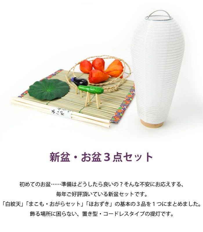 他の画像を見る 【ネットショップ限定価格!】新盆セット 白紋天は卓上・コードレス、人気の小珠! 3点セット [お盆 初盆 新盆 お盆ちょうちん 盆提灯 お盆飾り]【メモリアルアートの大野屋】 送料無料 税込価格 ¥ 6,400 税込 詳細を見る お気に入りに登録する