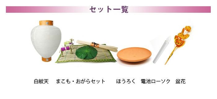 白紋天、まこも・おがらセット、ほうろく、盆花の基本の5品を1つにまとめました。