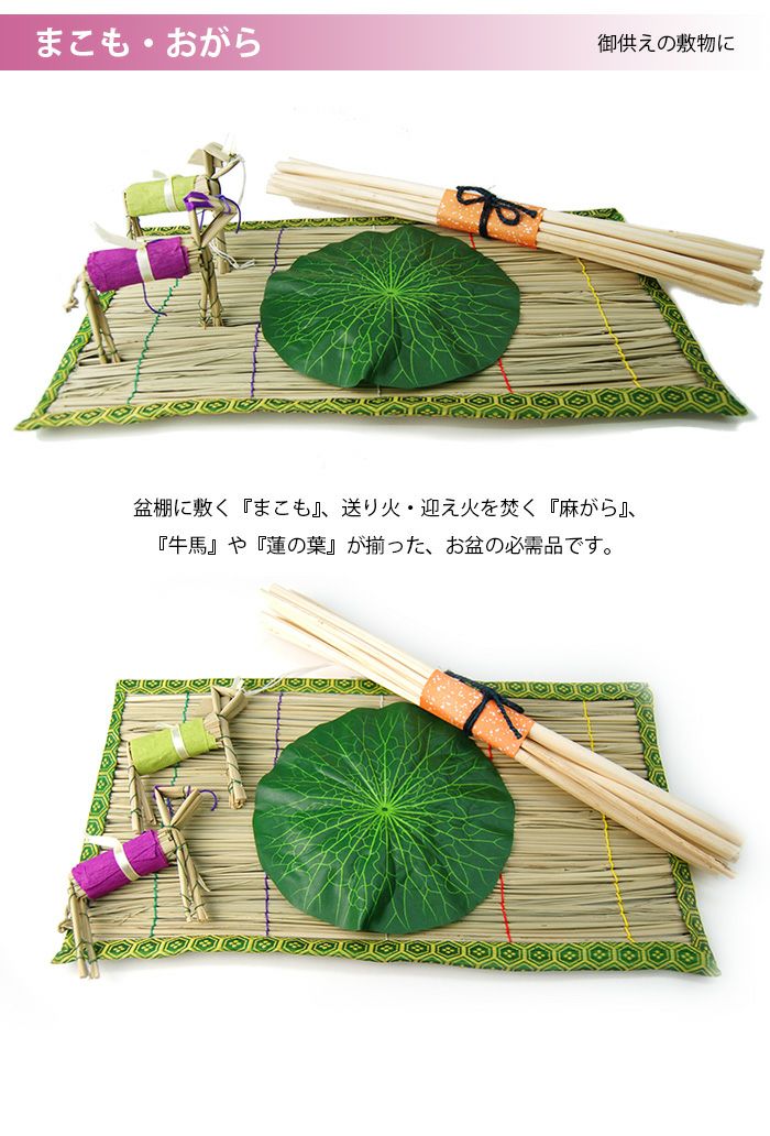 盆棚に敷く『まこも』、送り火・迎え火を焚く『麻がら』、『牛馬』や『蓮の葉』が揃った、お盆の必需品です。