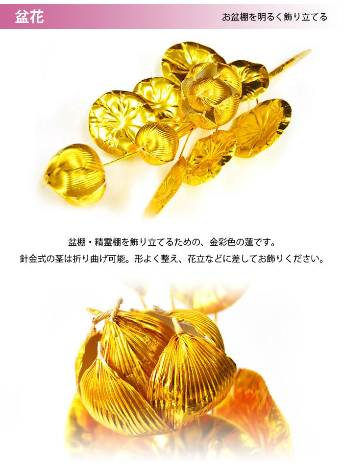 盆棚・精霊棚を飾り立てるための、金彩色の蓮です。蓮のつぼみが3つ(三輪)ついているタイプです。
