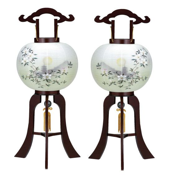 灯りは電気コード式、外火袋は絹張り(内火袋は和紙製)、柱は塗りの木製です。