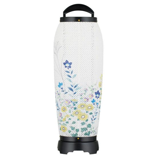 「創作提灯 回転灯 あかつき1号」は、火袋に桔梗と菊の柄をあしらった、モダン型の提灯。