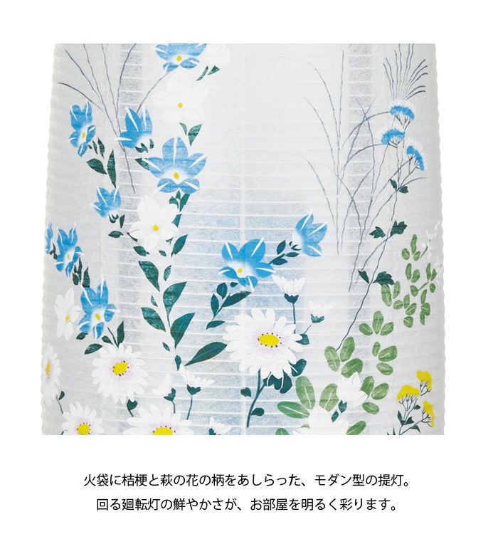 「創作提灯 回転灯 あけぼの 6号」は、 火袋に桔梗と萩の花の柄をあしらった、モダン型の提灯。