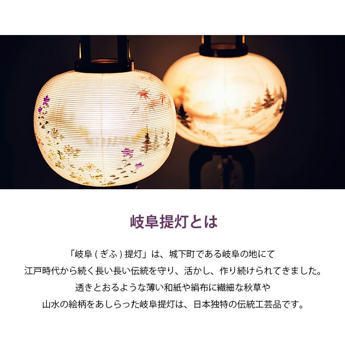 透きとおるような薄い和紙や絹布に繊細な秋草や山水の絵柄をあしらった岐阜提灯は、日本独特の伝統工芸品です。