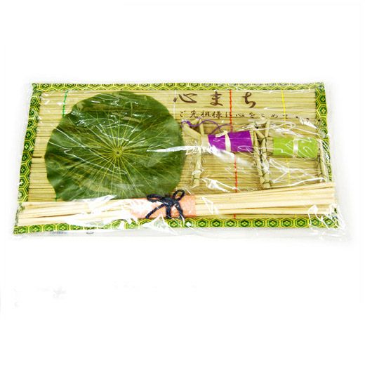 盆棚に敷くまこも、迎え火・送り火を焚くおがらのほか、牛馬、ハスの葉がそろったお盆の必需品です。