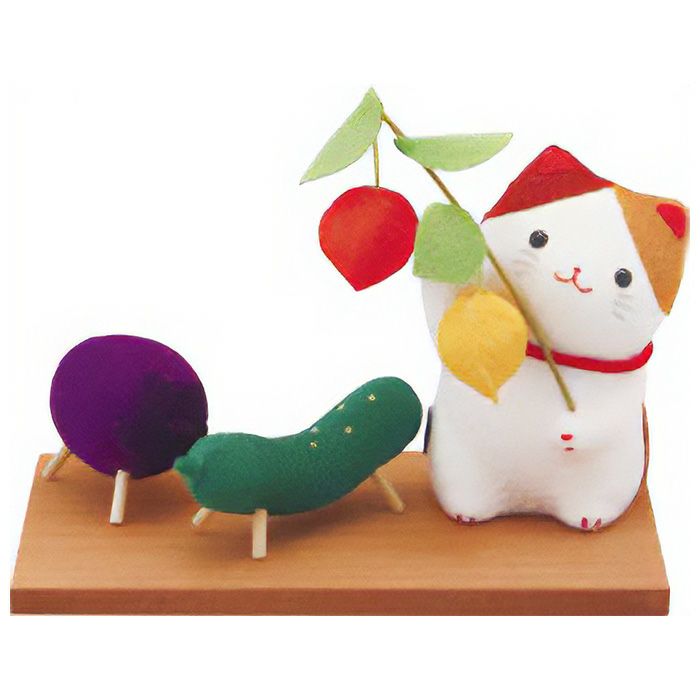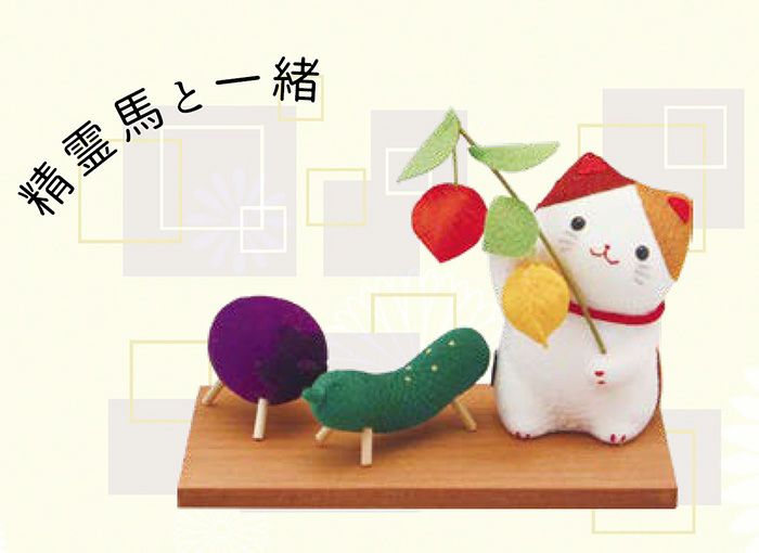 ちりめんで紡いだかわいらしい三毛猫の盆飾りと、お盆のお迎えに欠かせない精霊馬、二つで一つの愛らしい盆飾りに仕立てました。