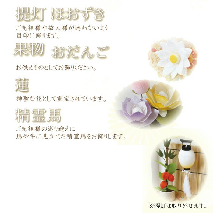 お盆の提灯、鬼灯飾り、お供えものに精霊馬。お盆のお迎えに必要な物を、全て一つにまとめました。