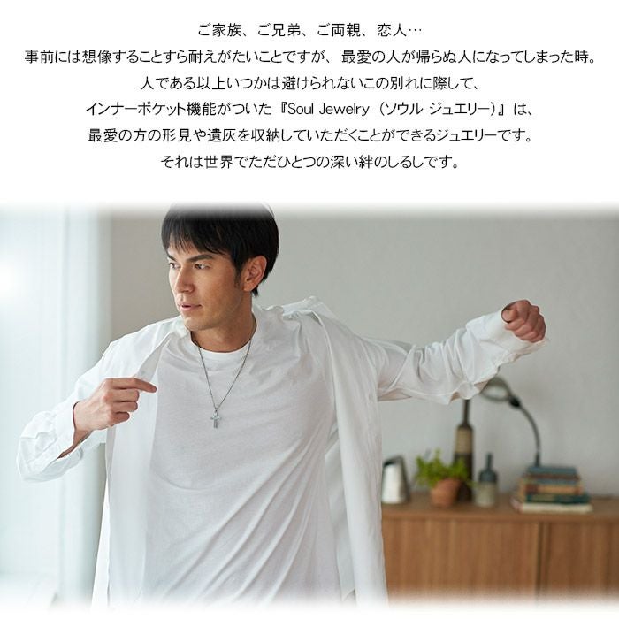 ご家族、ご兄弟、ご両親、恋人。事前には想像することすら耐えがたいことですが、最愛の人が帰らぬ人になってしまった時。人である以上いつかは避けられないこの別れに際して、インナーポケット機能がついた『Soul Jewelry(ソウルジュエリー)』は、最愛の方の形見や遺灰を収納していただくことができるジュエリーペンダントです。