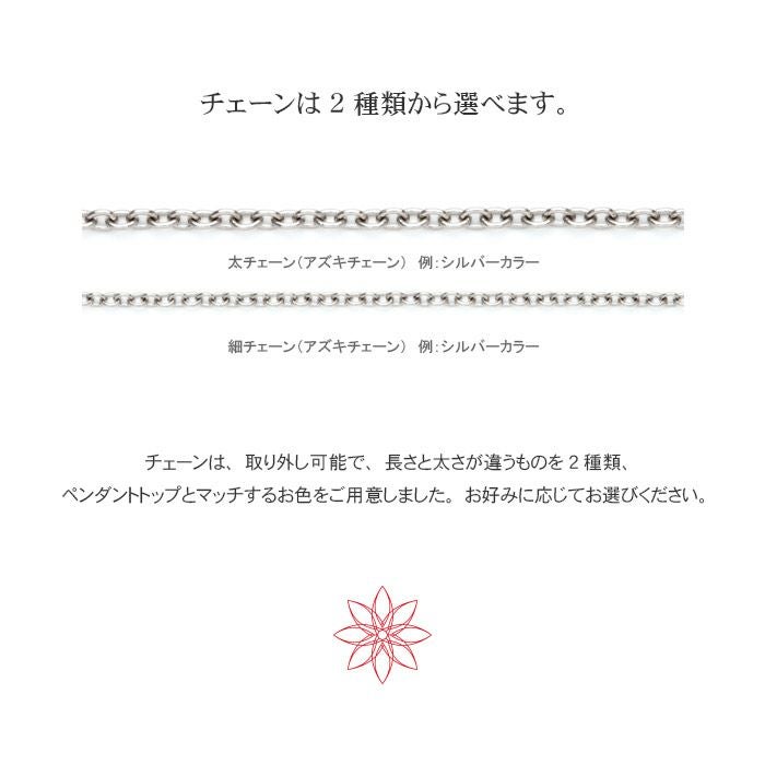 チェーンは、取り外し可能で、長さと太さが違うものを2種類、ペンダントトップとマッチするお色をご用意しました。お好みに応じてお選びください。