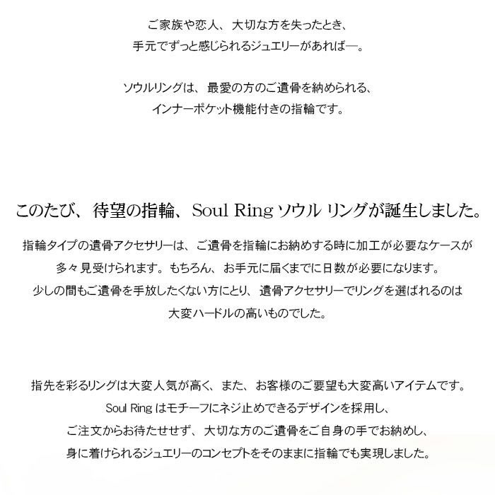 ソウルリングは、最愛の方のご遺骨を納められる、インナーポケット機能付きの指輪です。