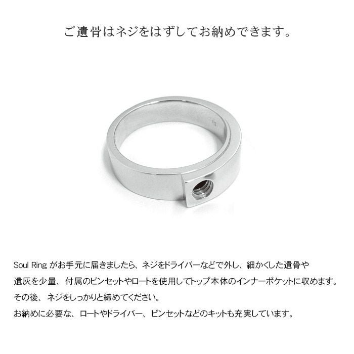 Soul Ringはモチーフにネジ止めできるデザインを採用し、ご注文からお待たせせず、大切な方のご遺骨をご自身の手でお納めし、身に着けられるジュエリーのコンセプトをそのままに指輪でも実現しました。
