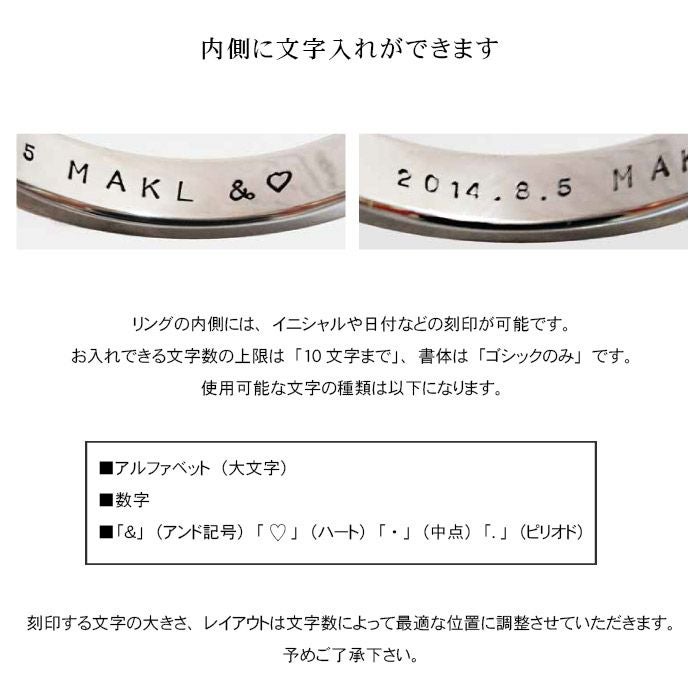 リングの内側には、イニシャルや日付などの刻印が可能です。