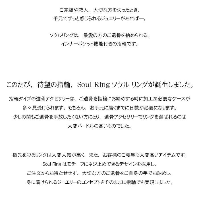 ソウルリングは、最愛の方のご遺骨を納められる、インナーポケット機能付きの指輪です。