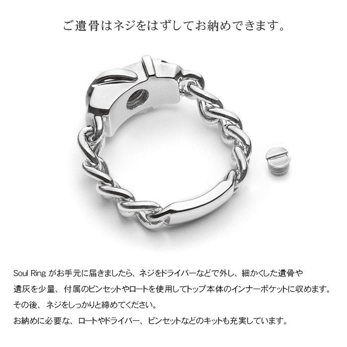 Soul Ringはモチーフにネジ止めできるデザインを採用し、ご注文からお待たせせず、大切な方のご遺骨をご自身の手でお納めし、身に着けられるジュエリーのコンセプトをそのままに指輪でも実現しました。