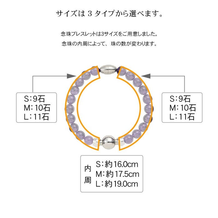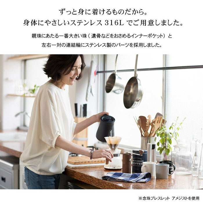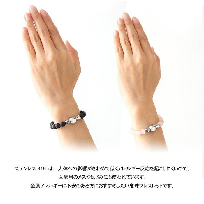 肌に触れる部分にステンレスパーツを使用しましたので、金属アレルギーに不安のある方におすすめしたい念珠ブレスレットです。