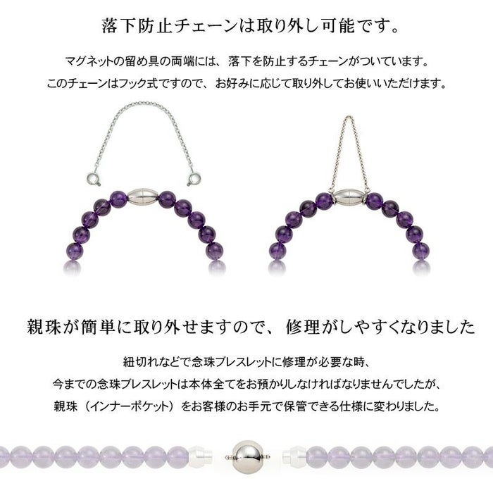 マグネットの留め具の両端には、ブレスレットを外す際に落下を防止するチェーンがついています。