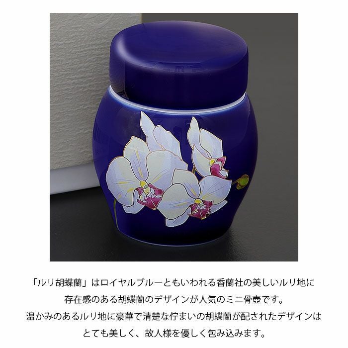 「ルリ胡蝶蘭」はロイヤルブルーともいわれる香蘭社の美しいルリ地に存在感のある胡蝶蘭のデザインが人気のミニ骨壺です。