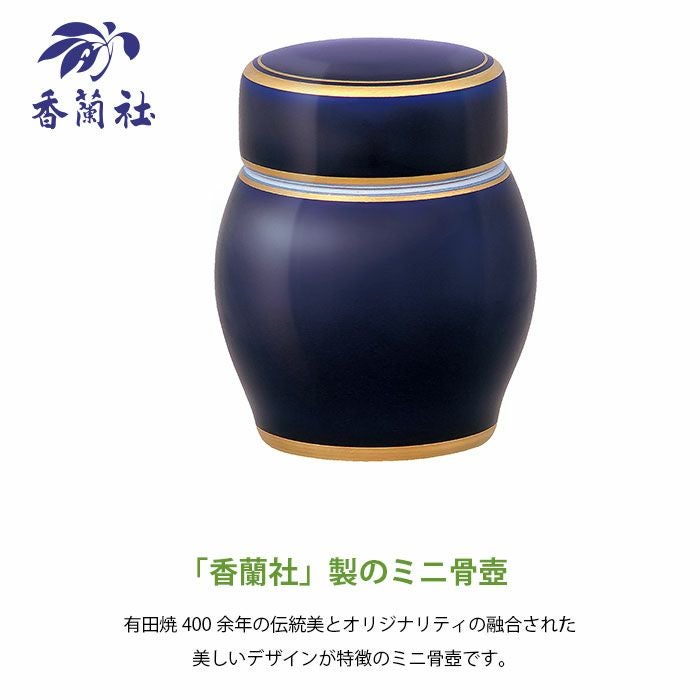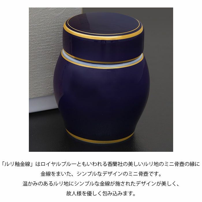 「ルリ釉金線」はロイヤルブルーともいわれる香蘭社の美しいルリ地のミニ骨壺の縁に金線をまいた、