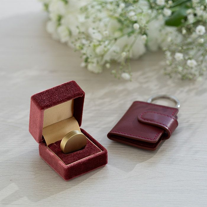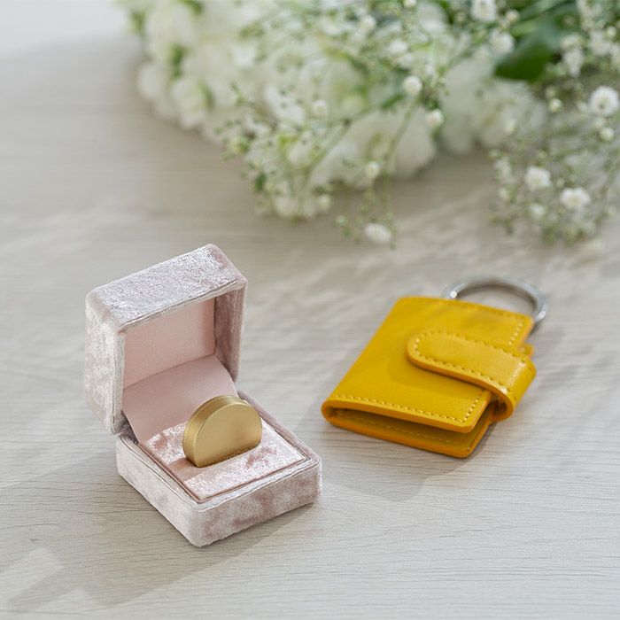 お出かけの時は携帯用ホルダーにいれてバッグチャームに、ご自宅では高級感あふれるベロア調の専用ボックスに入れて飾れます。