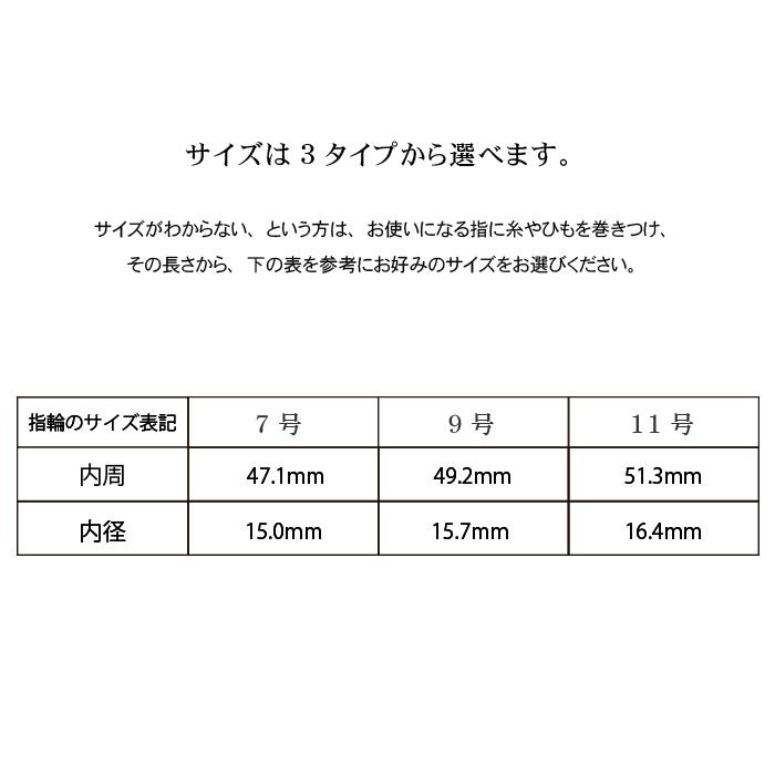 サイズがわからない、という方は、お使いになる指に糸を巻きつけ、その長さから、表を参考にお好みのサイズをお選びください。