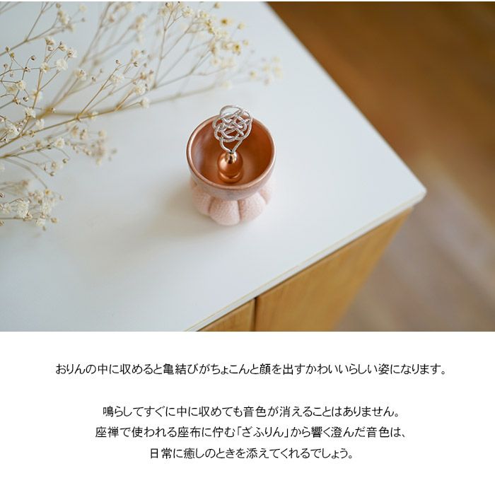 おりんの中に収めると亀結びがちょこんと顔を出すかわいいらしい姿になります。