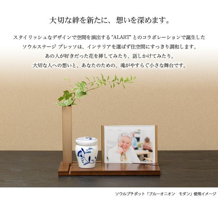 インテリアに馴染む、心地よさ。花を添え、話しかける、やすらぎの場所。 スタイリッシュなデザインで空間を演出する"ALART"とのコラボレーションで誕生したSoul Stage PRESSO ソウルステージ プレッソは、インテリアを選ばず住空間にすっきり調和します。