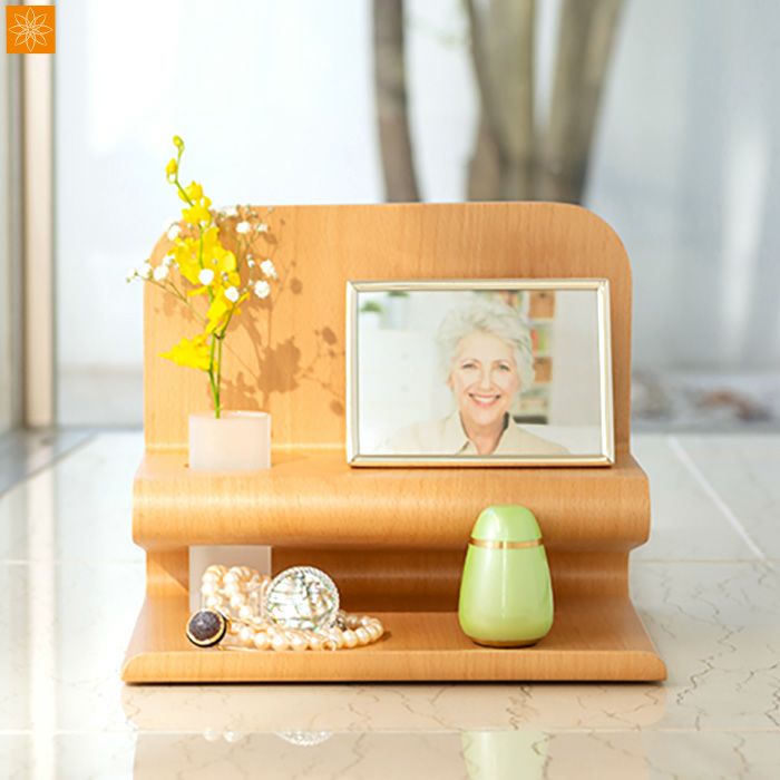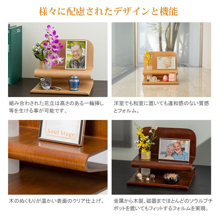 2段のステージなのでソウルプチポット・フォトフレーム・遺品等を自由度高く立体的に置くことができコンパクトで洗練された大切な人とのコミュニケーションスペースを作ることができます。