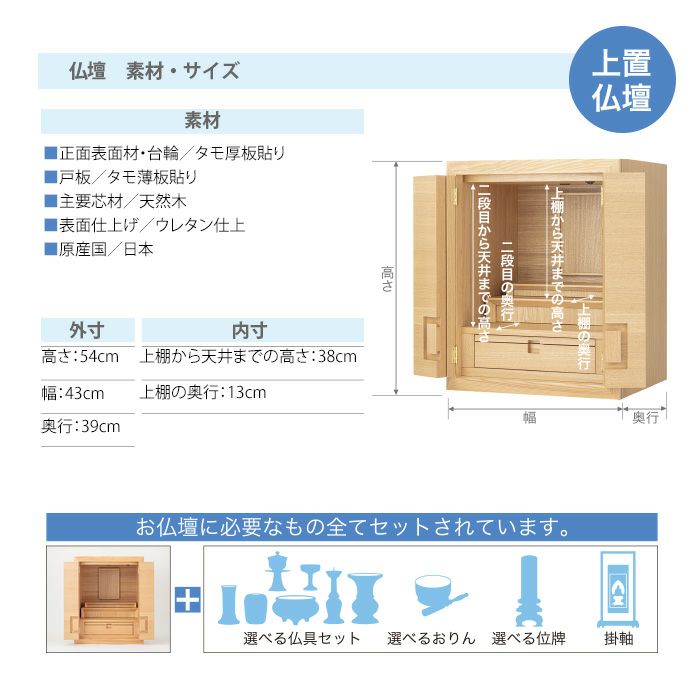 すべてのお仏壇には、仏具セット、おりん、位牌、掛軸など全てをセットしてのご提供となります。