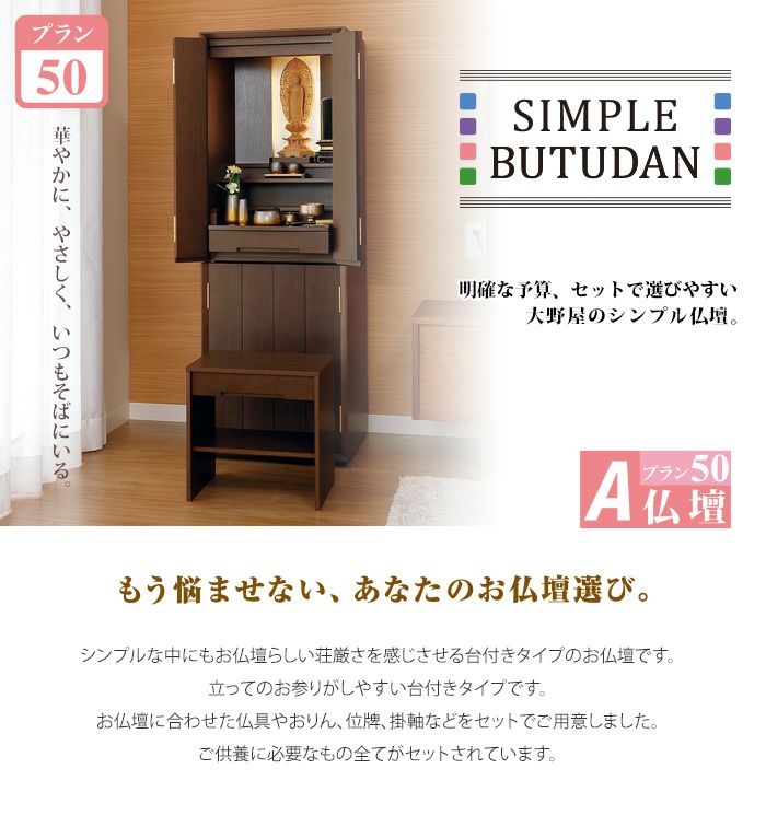 ・シンプル仏壇で提供する「仏具セット」「おりんセット」「位牌」「掛軸」それぞれ不要の方は、ご注文時に「不要」のメニューを選択してください。尚、不要を選ばれた場合(1つのみ、あるいは複数)でも、ご提供価格に変更はございません。