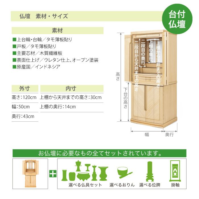 すべてのお仏壇には、仏具セット、おりん、位牌、掛軸など全てをセットしてのご提供となります。