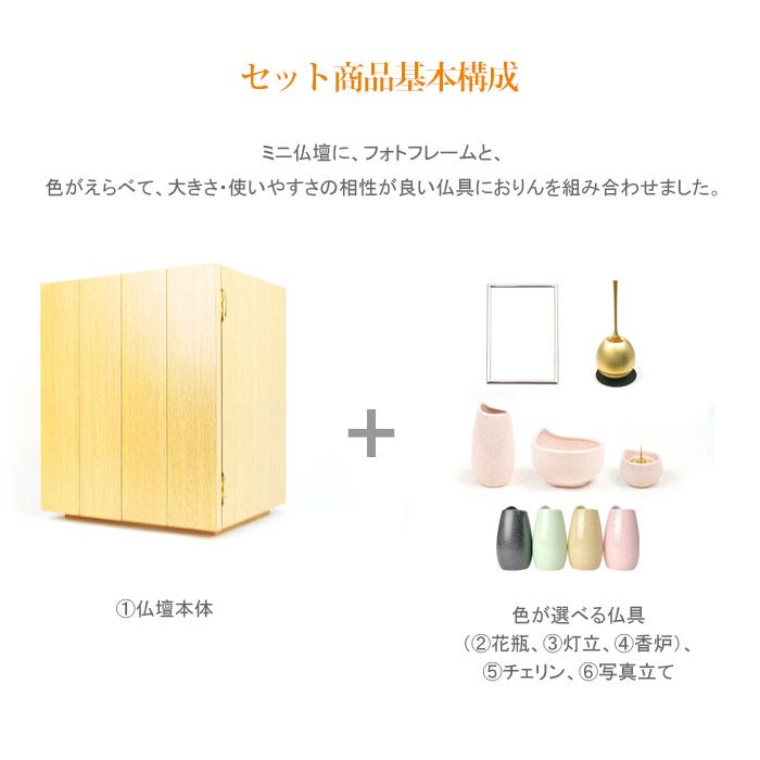 2つの色から選べる仏壇(1)に、仏具(花立(2)灯立(3)香炉(4))、おりん(5)写真立て(6)、をセット。届いたその日からご供養頂けます。