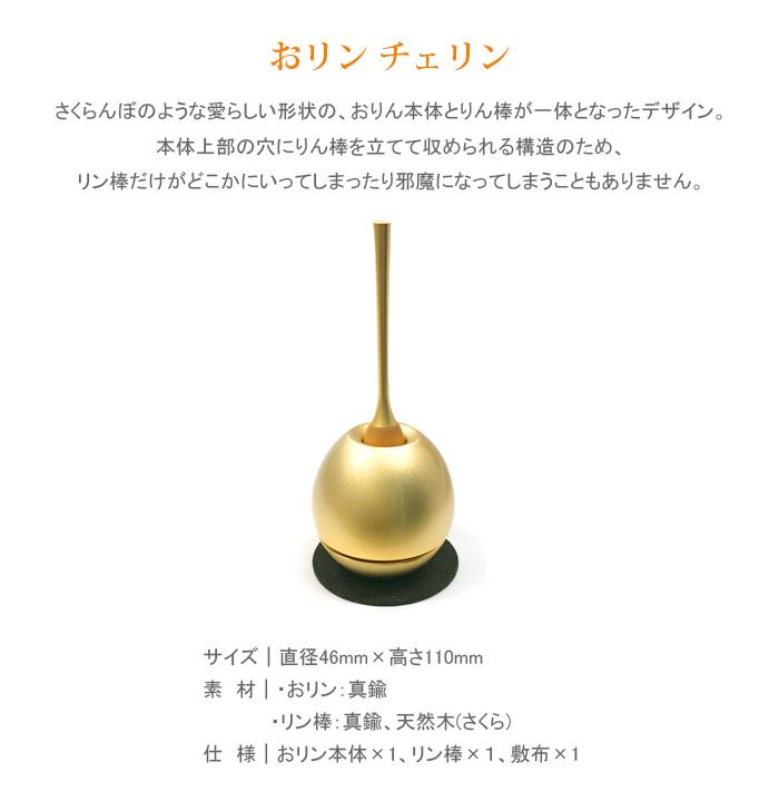チェリンは、さくらんぼのような愛らしい形状の、おりん本体とりん棒が一体となったデザイン。