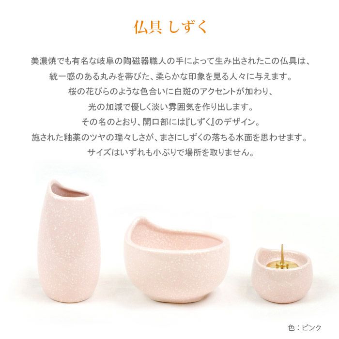 美濃焼でも有名な岐阜の陶磁器職人の手によって生み出されたこの仏具は、統一感のある丸みを帯びた、柔らかな印象を見る人々に与えます。