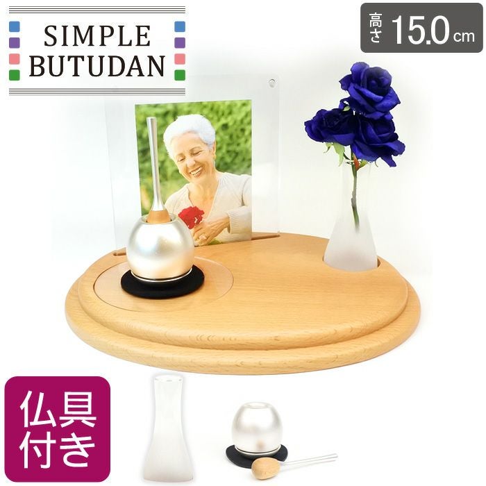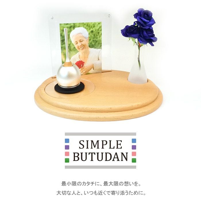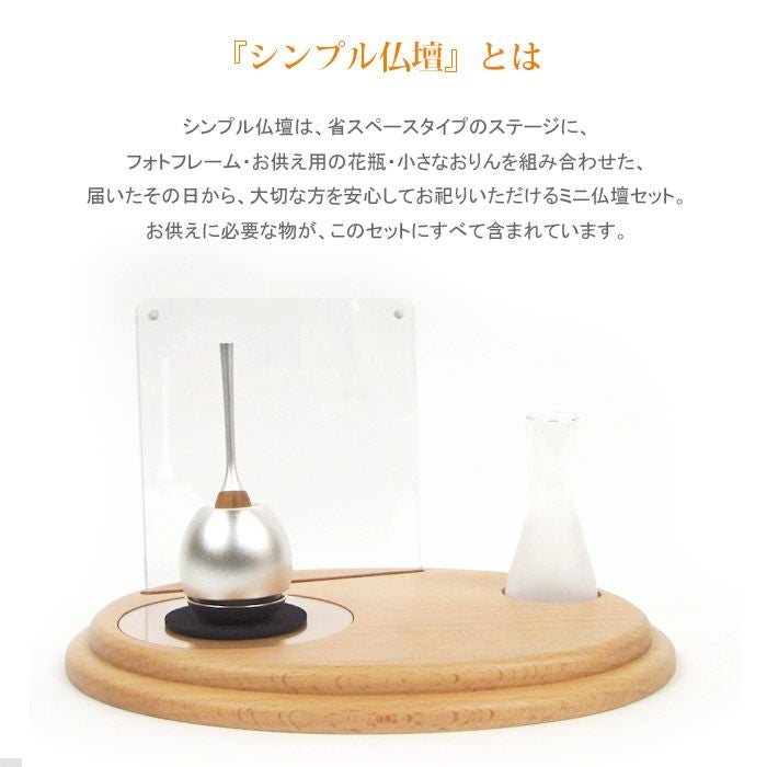 省スペースタイプのステージに、フォトフレーム・お供え用の花瓶・小さなおりんを組み合わせました。