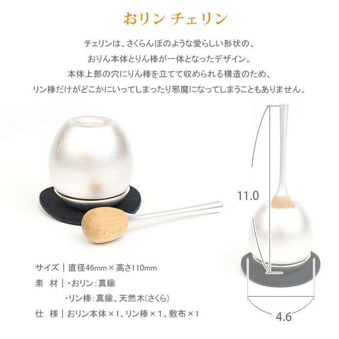 チェリンは、さくらんぼのような愛らしい形状の、おりん本体とりん棒が一体となったデザイン。