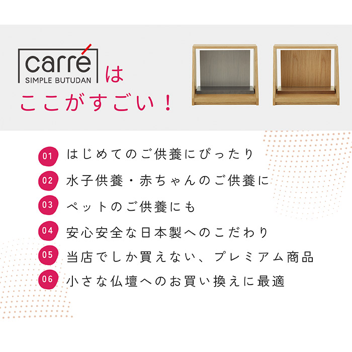 ミニ仏壇「carre(カレ)」は、ご家族や大切な方、故人その人をお手元で偲ぶための小さなお仏壇です。