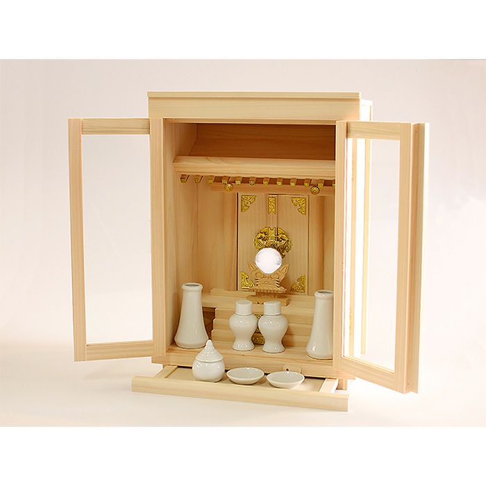 正面のガラス戸は観音開きとなっており、扉下には神具を置くことのできる膳引出付。