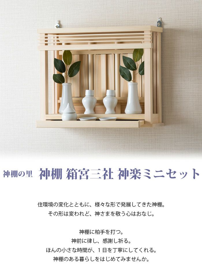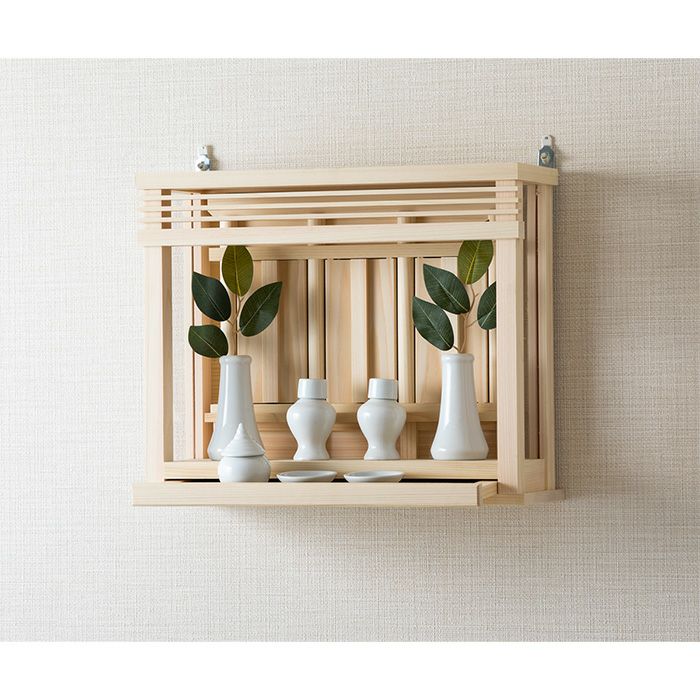 箱宮背面に壁取付金具が付いており、神棚本体に神具を乗せることのできる膳引出付き。