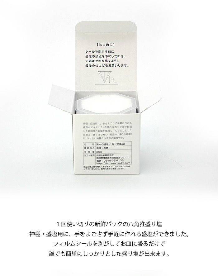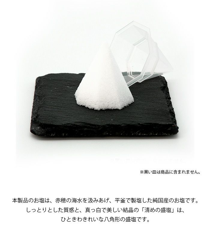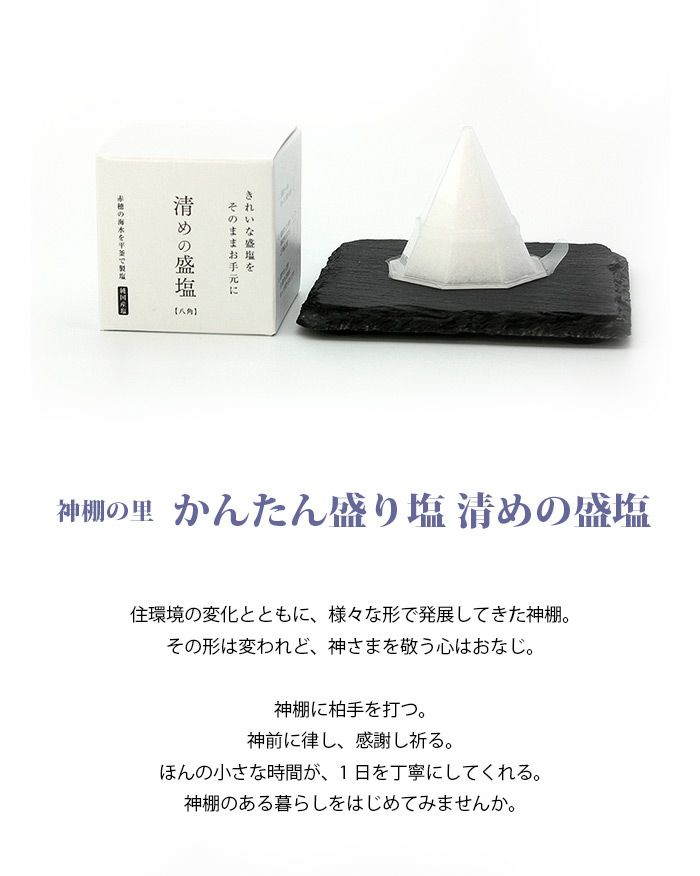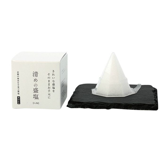 しっとりとした質感と、真っ白で美しい結晶の「清めの盛塩」は、ひときわきれいな八角形の盛塩です。