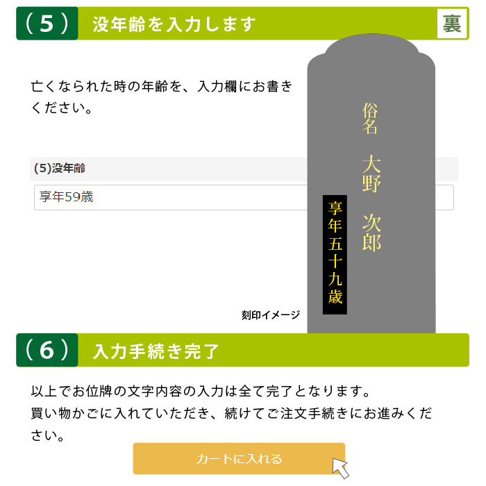 ショッピングカートボタン上部にあるそれぞれの入力項目へ、お位牌へ入れる文字内容をご入力ください。