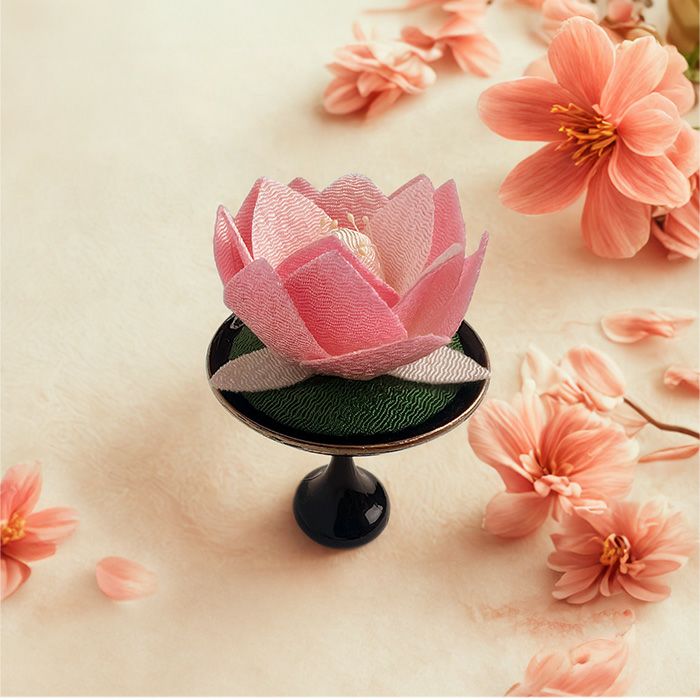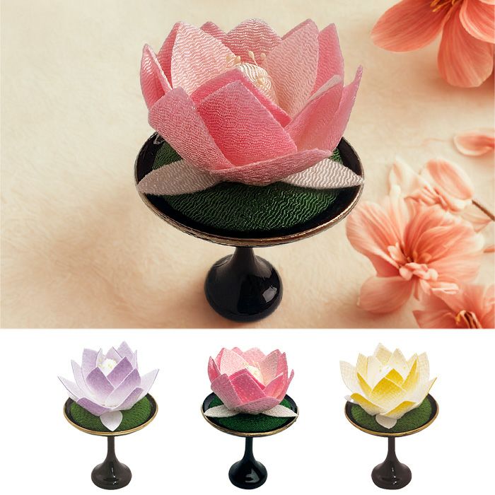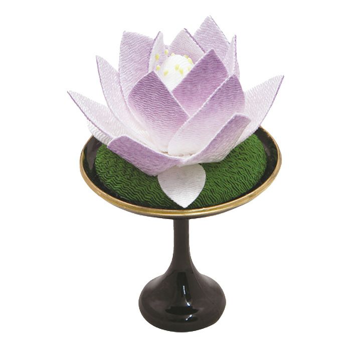 やさしい風合いのちりめん細工で仕立てた、蓮の花のたかつき飾りです。
