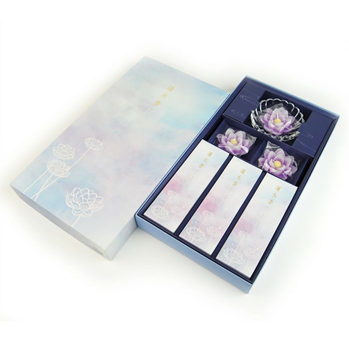 お線香3箱。蓮華型のキャンドル3つ。線香とろうそくの専門店同士がその業をかけて作り上げました。