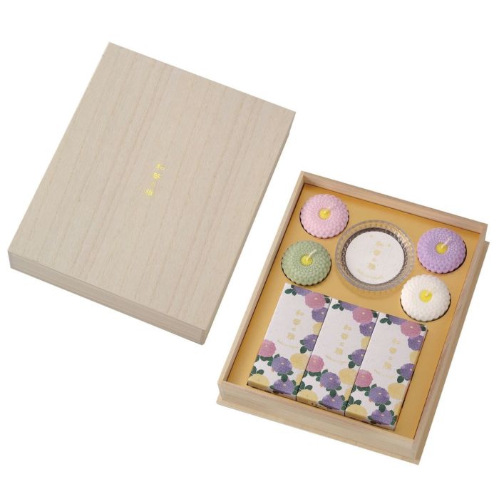 昔から高貴で邪気を払うとされてきた「菊」をモチーフに、やさしいニュアンスカラーで彩ったローソクと線香の進物。